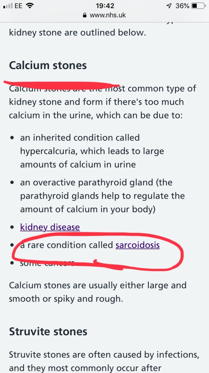 I was also told to read up about kidney stones on the NHS website. I got as far as reading about calcium stones and the fact they can be caused by “a rare condition called sarcoidosis” before I had all I needed.